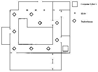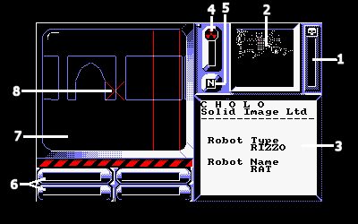 Der RAT DROID befindet sieh am Anfang im Zentralcomputer gebäude und steht dem Eingang zugekehrt. Es liegt nur wenige Meter von der Bridge Street entfernt. Durch die Benutzung der Steuertasten für den HAUPTROBOTER (siehe Tastentabelle) können Sie den RAT-Droiden in den Computer hineinsteuern (er ist auf der Karte unten abgebildet) und ihn so leicht mit dem dort befindlichen CYBER Computer zusammenstoßen lassen. Dann stellt RAT ein Interface mit CYBER I her und kann so Programme mit ihm austauschen.